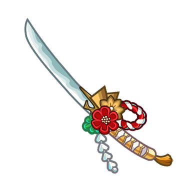 - 縁起のいい紅白の華をあしらった刀。斬れ味も素晴らしい。