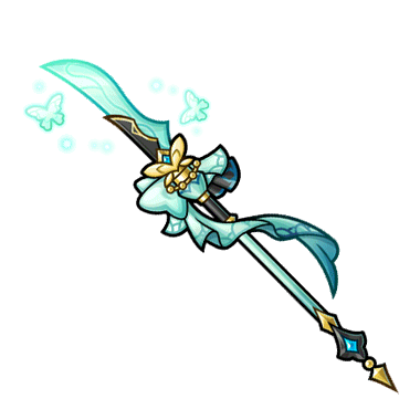 - 蝶をイメージしたリボンがあしらわれた槍。放った一振りの軌跡には、蝶が舞い、その一振りが戦いに思わぬ結果をもたらす。