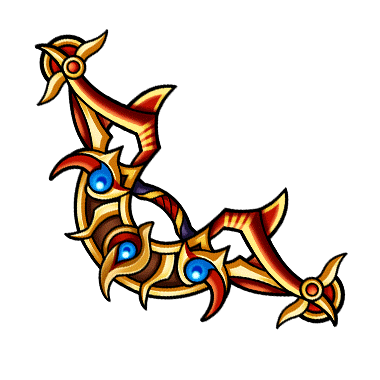 - 勾玉がはめ込まれた独特な形状の弓。この弓を持つと集中力が高まり、どんな人でも揺れ動く扇を射抜けるようになるという。
