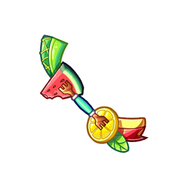 - いろいろなフルーツが刺さったフォーク。で作られた弓。