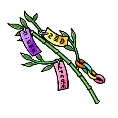 - 笹を用いた自然を感じさせる杖。短軸に意気込みを書いてモチベーションを高めよう!