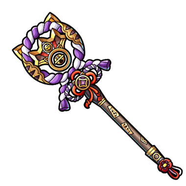 - 才覚と勇猛果敢な精神を宿した杖。放つ魔法は、多くの者の希望と温もりを与え、新たな一歩を踏み出させる勇気を与えてくれるという。描寅の十二神将シンドゥラが扱う武器の一つである。