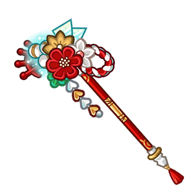 - 縁起のいい紅白の華をあしらった杖。破魔の力を宿し淡い光を放っている。