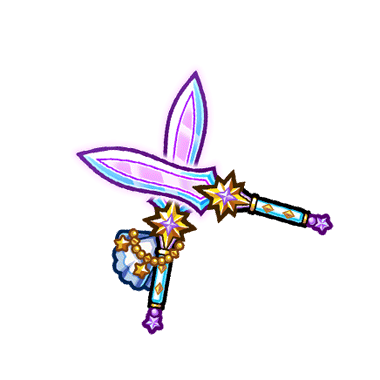 - 明けの空に瞬くきら星をあしらった双剣。夕闇に光る宵の星の双剣と対になっている。