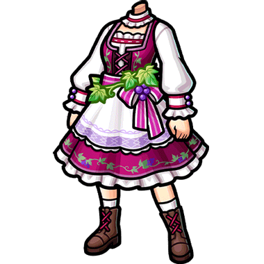 - 収穫祭に合わせて仕立てられた葡萄モチーフの衣装。ツタの刺繍が細かく施され、フリルがたっぷりとあしらわれている。腰飾りからは、ほのかに葡萄の香りが漂う。