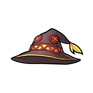 - めぐみんの帽子。トンガリ状になっていて、見た目から魔法使いとわかるデザイン。目のように見える装飾が2つ施されている。