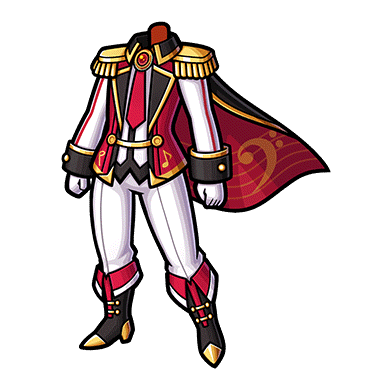 - とある楽団の正装。武器で音を奏でる伝説の音楽集団が着ていた衣装として、現在も楽団に受け継がれている。 マントの裏地に音楽記号が描かれている。