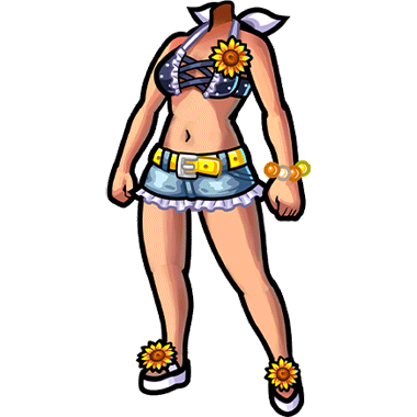 - ところどころにあしらわれたひまわりが可愛らしいビキニ。腰のベルトの黄色が全体のデザインのバランスを整えている。