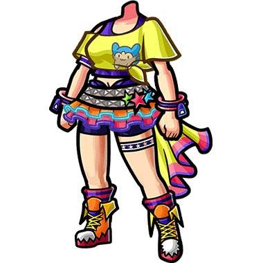 - りみぴょんがライブ中に着用する衣装。胸元にはりみみんずがプリントされている。カラフルなステージ衣装。