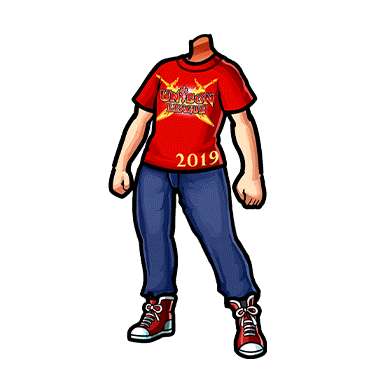 - ユニゾンリーグチャンピオンシップ2019の公式Tシャツ。アンリミテッド部門の参加賞として配布されるのは情熱の赤色。