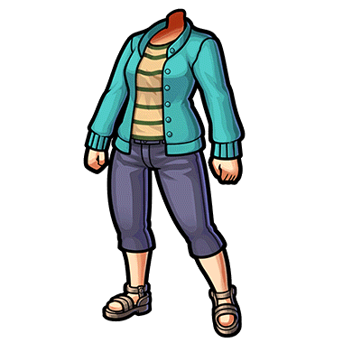 - 藤村先生の服。明るく元気で活発な彼女らしいパンツスタイル。