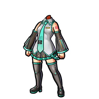 - 初音ミクの服。銀色、明るい緑が特徴の服。長いネクタイ、ミニスカート、ハイソックスがポイント。