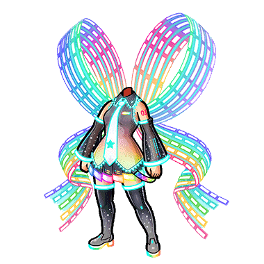 - 10周年を祝う初音ミク専用にデザインされた衣装。全体的にお祝いをイメージできるデザインとなっておりリボンや発光はレインボーとなっている。