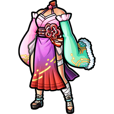 - ミンチューバーぬらりひょんの衣装を模した服。腰についた梅の結び飾りと裾模様がポイント。