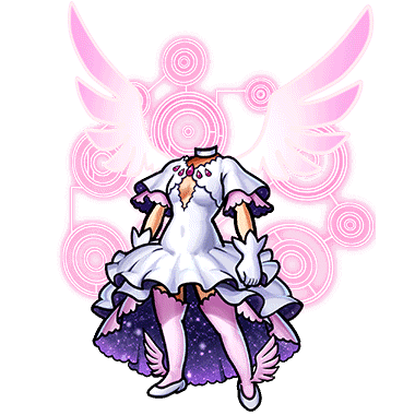 - 魔法少女の最期を導く円環の理が纏うドレス。清楚さと豪奢さを併せ持つ。後光がさすような輝きは見る者に神を想像させる。