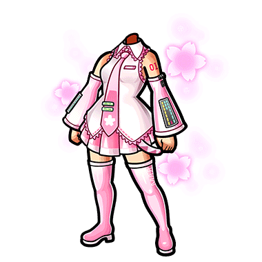 - 桜ミクの服。白とピンク色で統一された服に加えて、桜を散らしてうららかな雰囲気に。歌う前から観客を春色に染め上げ、虜にする。
