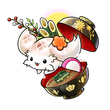 - 新年の日の出とともに現れるおめでたいリミミン。初日の出を背負うお雑煮姿で登場!「みんなで新年をお祝いするミン!」