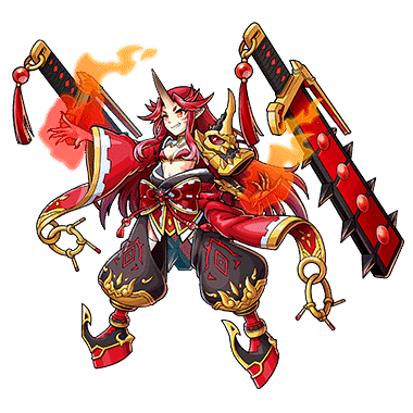 - かつての戦いで片腕を失った茨木童子。しかしその力はとどまる所を知らず。 今日もどこかの戦場で、鬼面の義手と二振りの大太刀と共に、朱色の一閃となることだろう。