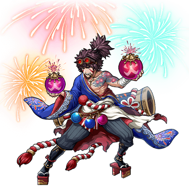 - 大の派手好きにして、誰もが認めるお祭り男。 騒ぎだ祭りだと聞きつければ、お手製の花火を携えて駆けつける。 「まあ、こまけぇことはいいんだよ。ド派手にでっかい花火が上がれば、最高の気分だろうよ!」