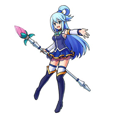 - 水を司る女神。熱烈な信者ばかり擁するアクシズ教の御神体でもある。死者を案内する女神だったが、カズマの死因を馬鹿にしたところ、怒ったカズマにより異世界転生に巻き込まれた。普段は女神らしい神々しさは皆無、しかも酒と宴会が好きで自分が女神であることすら忘れるときがある。カズマなどの一部例外を除いて全く信じてもらえていない。
