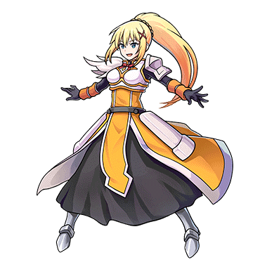 - 金髪碧眼で美人女騎士。カズマとアクアの出した求人の張り紙を見て仲間に加わる。が、実はドMで、平常時、戦闘時関係なく機会が訪れれば己の願望を叶えるため、皆の盾になることを願いでている。