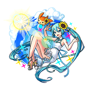 - 真っ白なワンピースとひまわりの髪飾りをつけて海を訪れたミクさん。普段なかなかゆっくりする機会がないので、束の間のバカンスにとてもご満悦。海で遊んでいたとしても、ミクさんの輝きは衰えを知らず。夏の日差しも、ステージ上のミクさんを照らす照明になってしまう。
