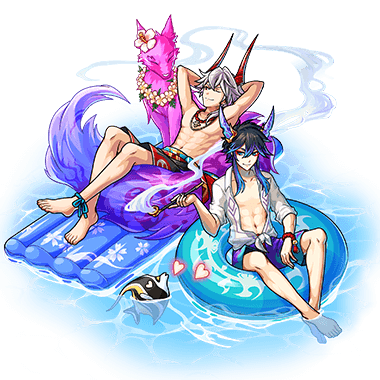 - 水着に着替え真夏の海にやってきたミツナリと夜叉丸。 魅惑の二人組は、海の生き物にも好かれている。