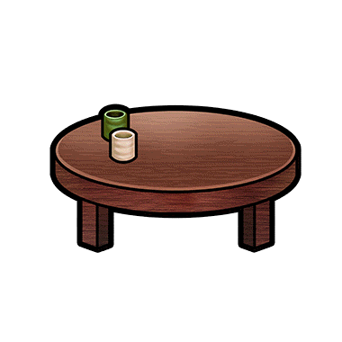 渋めの色使いのちゃぶ台。ペアで置かれた湯飲みに心が和む。