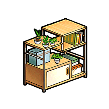 収納力に秀でたベージュ色の棚。独特なデザインでお部屋におしゃれ感をプラス。