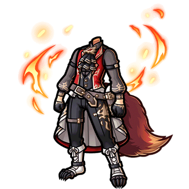 - フェルムローゼが力を解放した時の姿をイメージした男性用のスーツ。 ほとばしる炎と獣の尻尾は、苛烈にそして華やかに戦う彼女のトレードマークである。