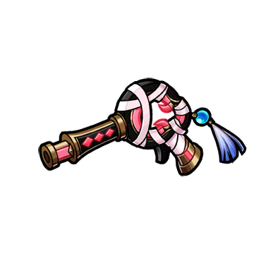 - 朱と黒の色が重なり合う、不気味な印象の銃。 銃身に巻き付く白い布は鬼を封じるほどの力が込められている。 布は戦う上で枷にならず、そこから溢れる呪力は敵の命を蝕む。