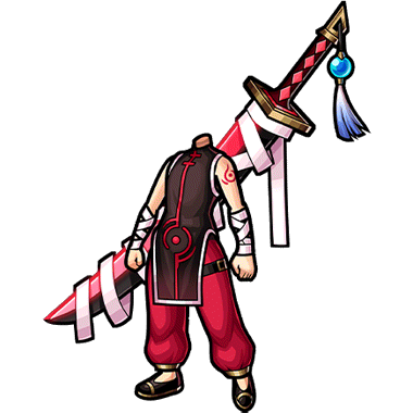 - 朱と黒が鮮やかな、不気味な印象の戦装。 背負った太刀に巻き付く白い布は鬼を封じるほどの力が込められている。 布から覗く朱色の刀身は獲物を狙うがごとく光っている。
